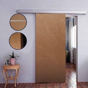 Puerta placa corrediza COLGANTE tipo GRANERO con herrajes de aluminio anodizado natural